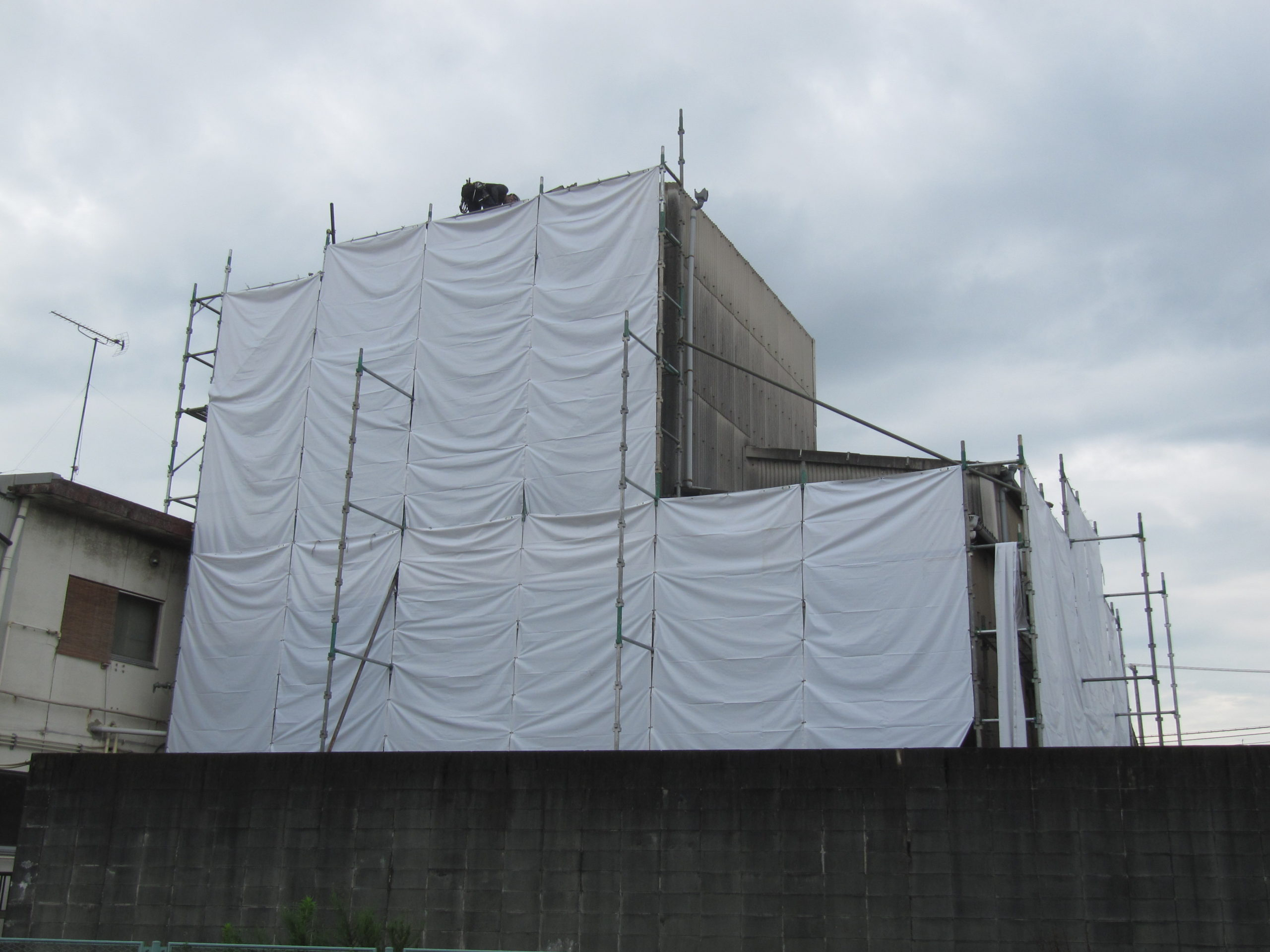 作業にあたっては、粉塵や建材の飛散を防止するため、建物全体をシートで囲う養生作業を最初に実施いたしました。周辺環境への配慮は解体工事において最も重要な要素の一つです。